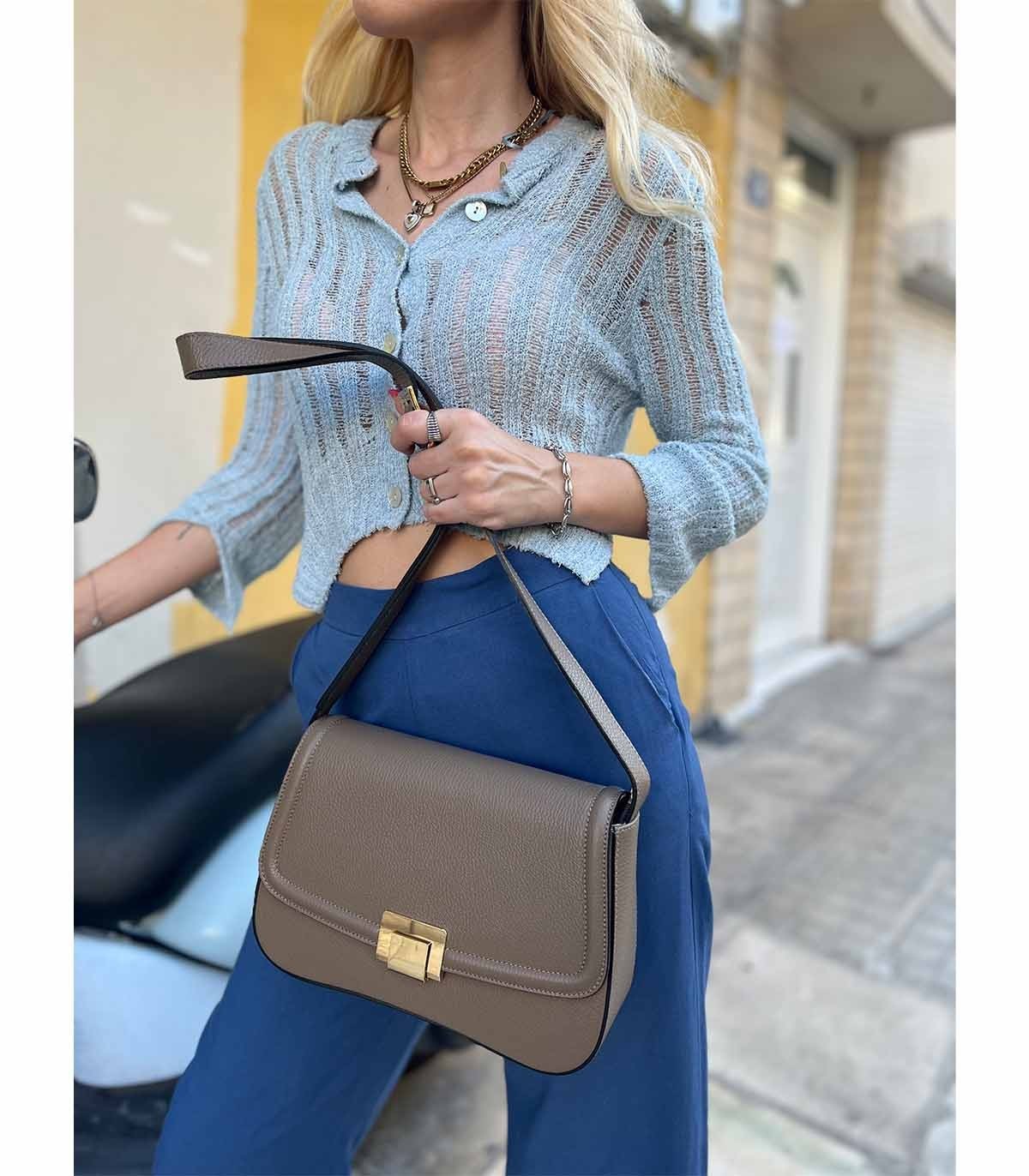 Το ρυθμιζόμενο δερμάτινο λουράκι επιτρέπει να φορεθεί είτε στον ώμο, για πιο κλασικό look, είτε χιαστί, για άνεση και ελευθερία κινήσεων.